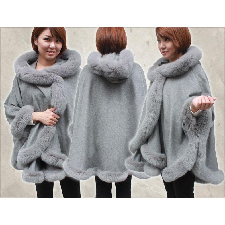 美品✨Diagram カシミヤ×FOXファー フードケープ ポンチョ グレー F カシミヤ100% ファーケープ FOXフード付き ファーマント レディース